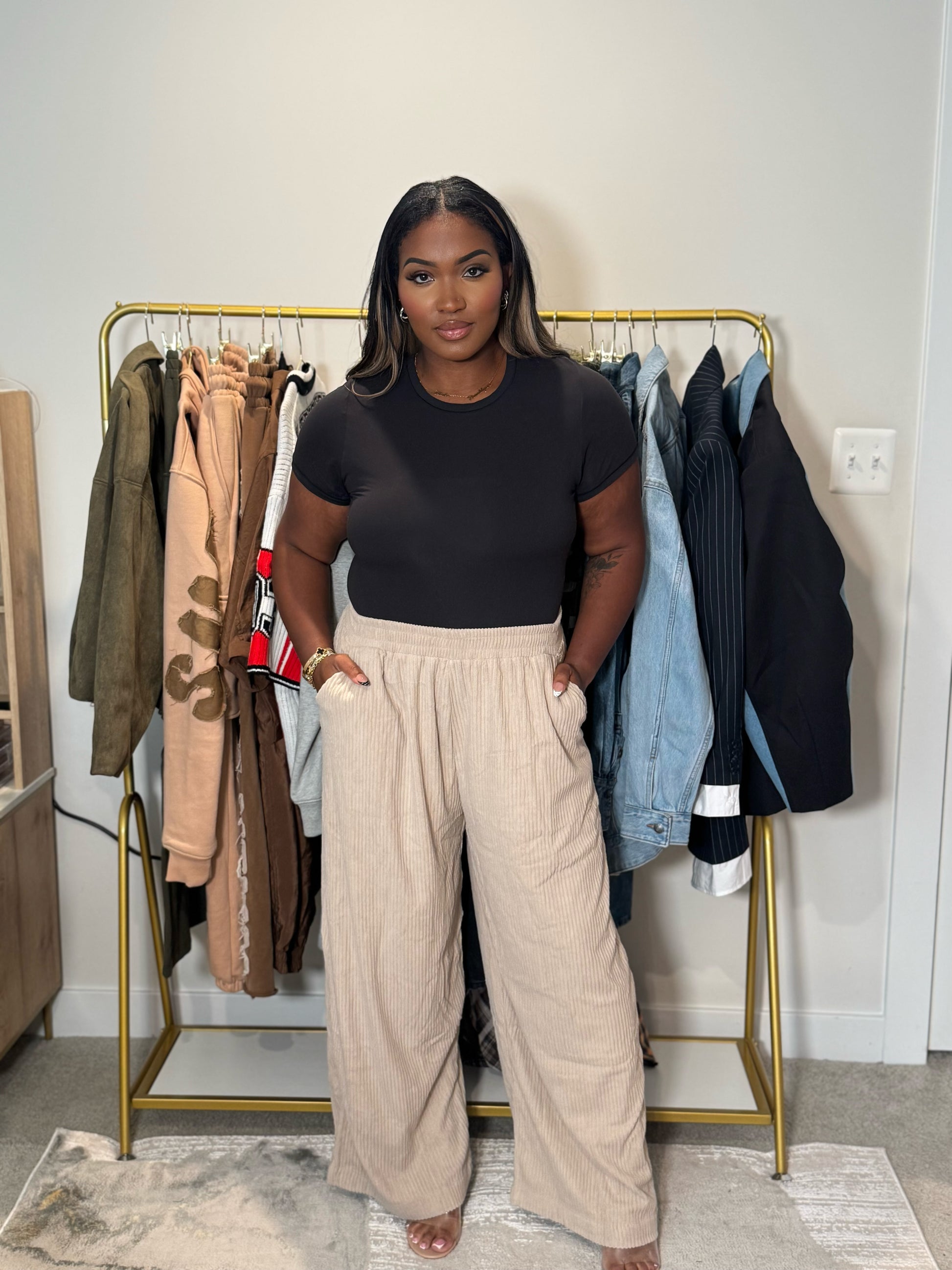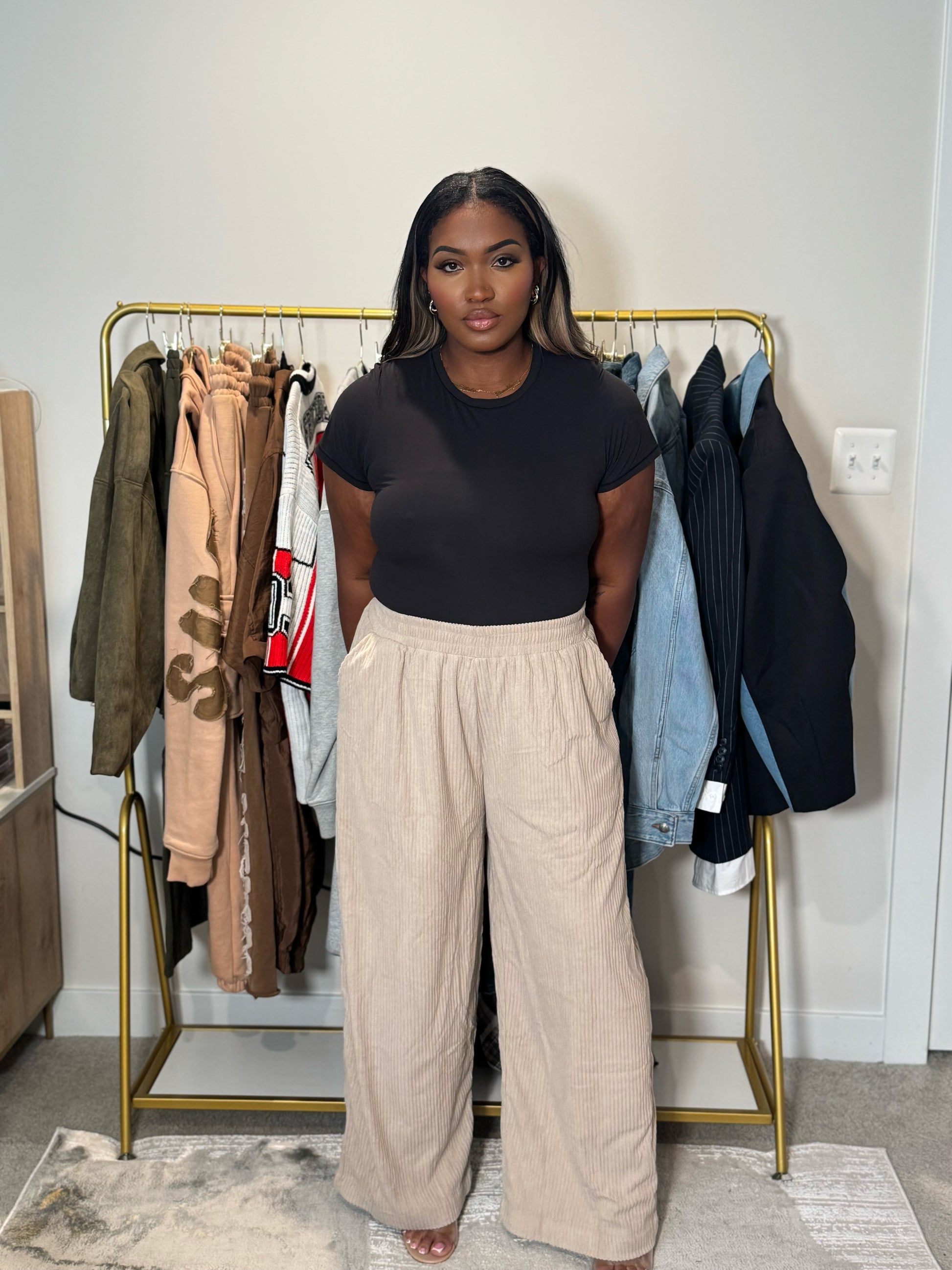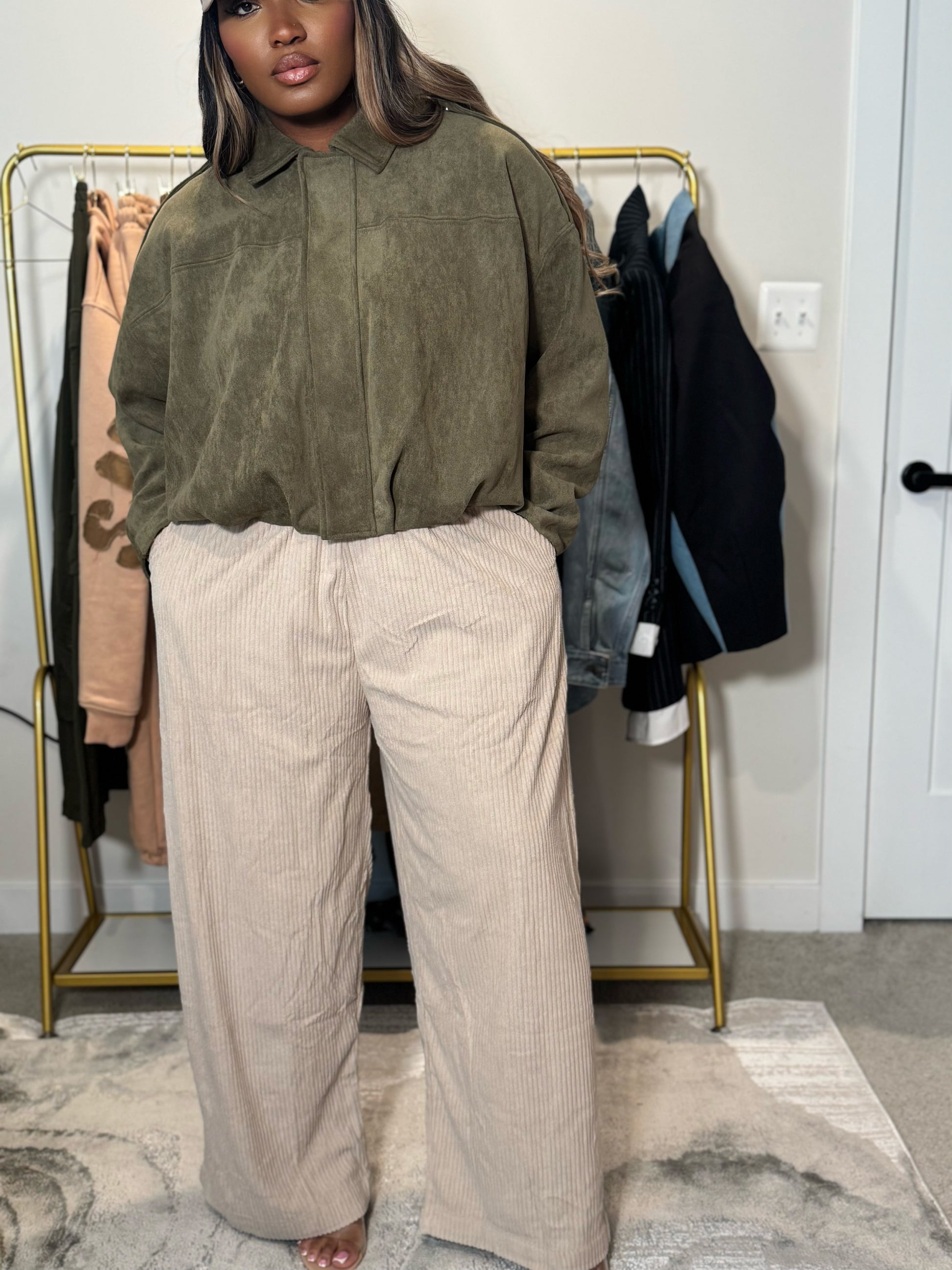 High-waisted baggy sweatpants with corduroy-like material. For a more oversized look, size up. Model is wearing a Medium.